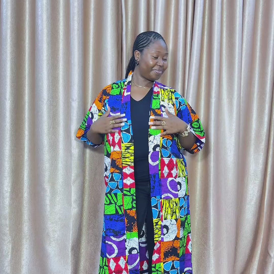 CINDER is a bold, colourful Ankara patchwork kimono designed to elevate any outfit effortlessly. Handmade with vibrant mixed Ankara prints, this statement jacket adds personality, culture, and flair to both casual and dressed-up looks.
