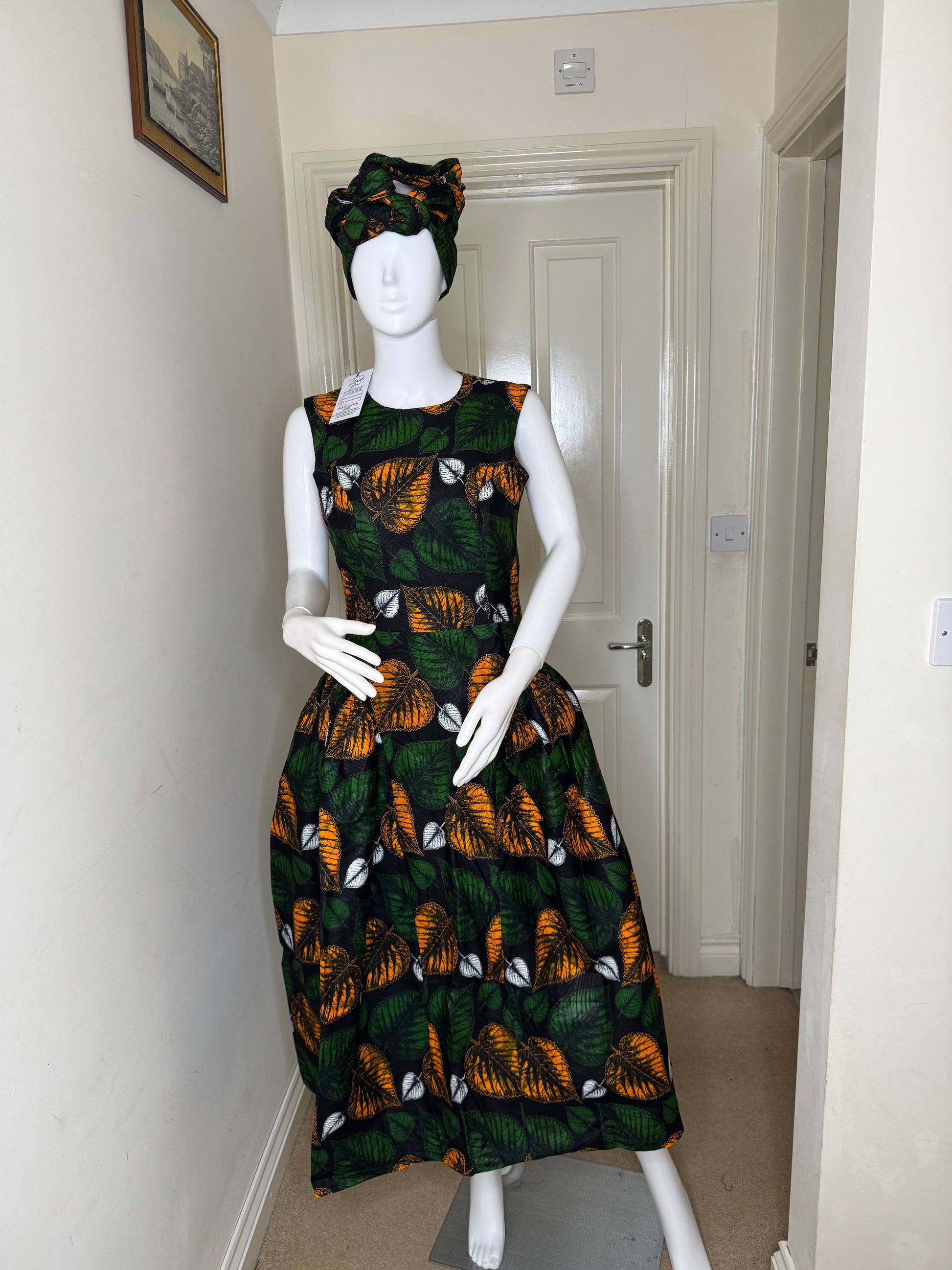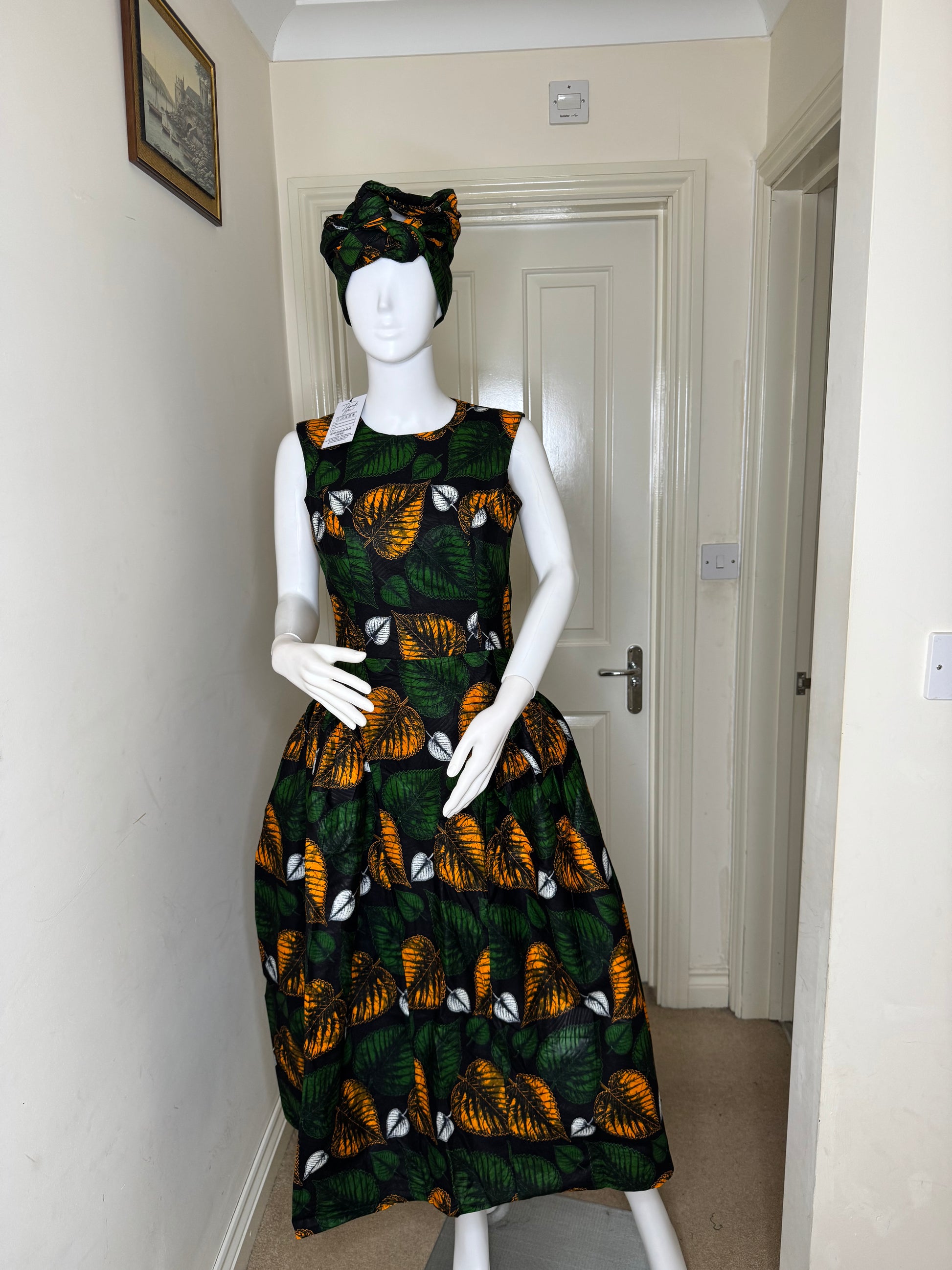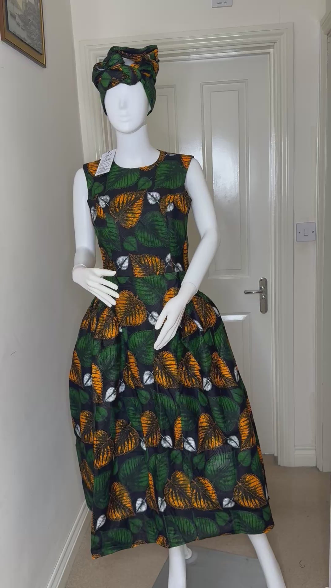 - Made from bold green and golden leaf print Ankara cotton, fully lined for comfort