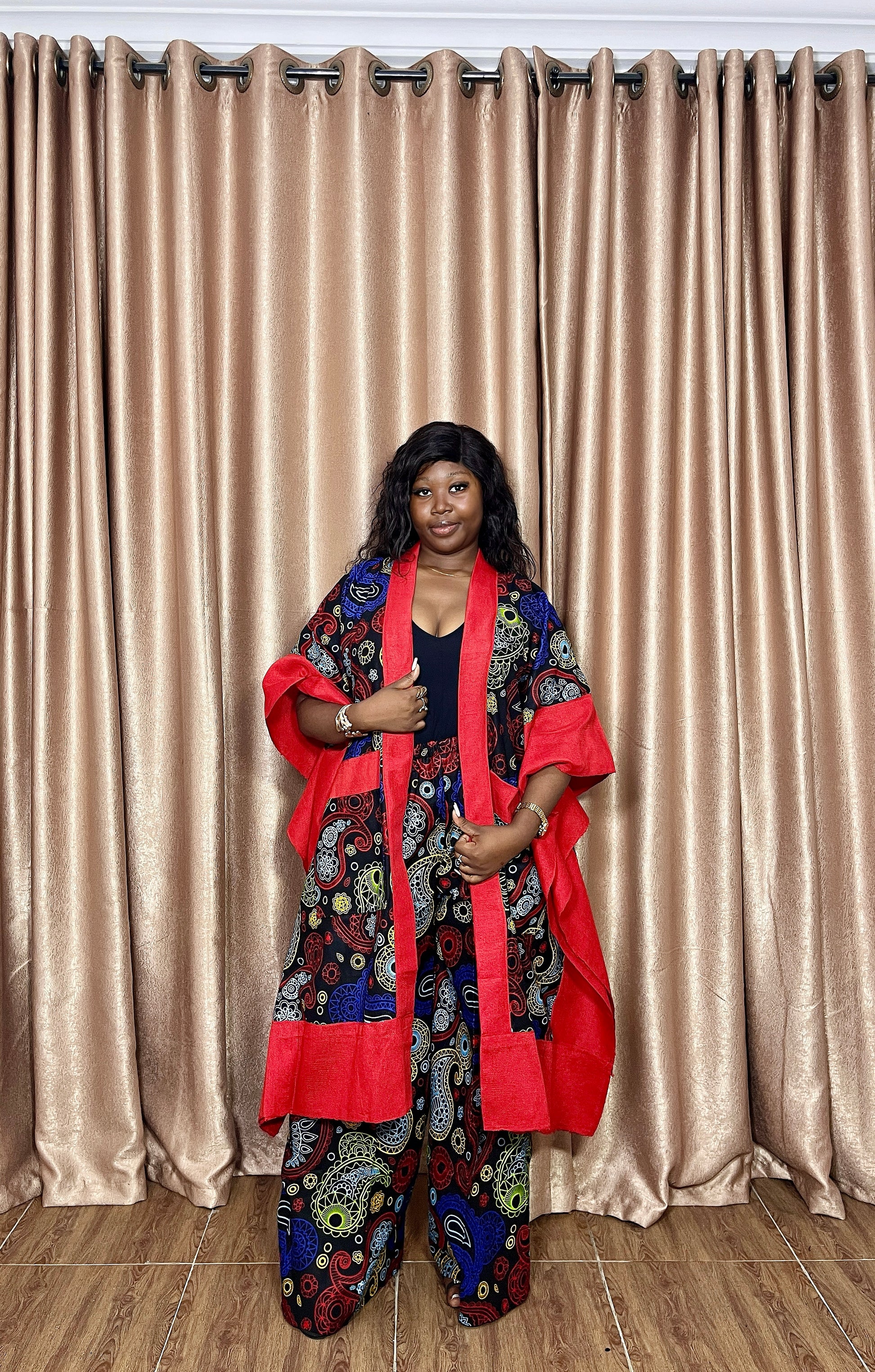 It features a flowing kimono-style top and wide-leg trousers (45” length) — perfect for weddings, parties, and cultural occasions.